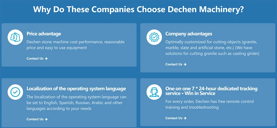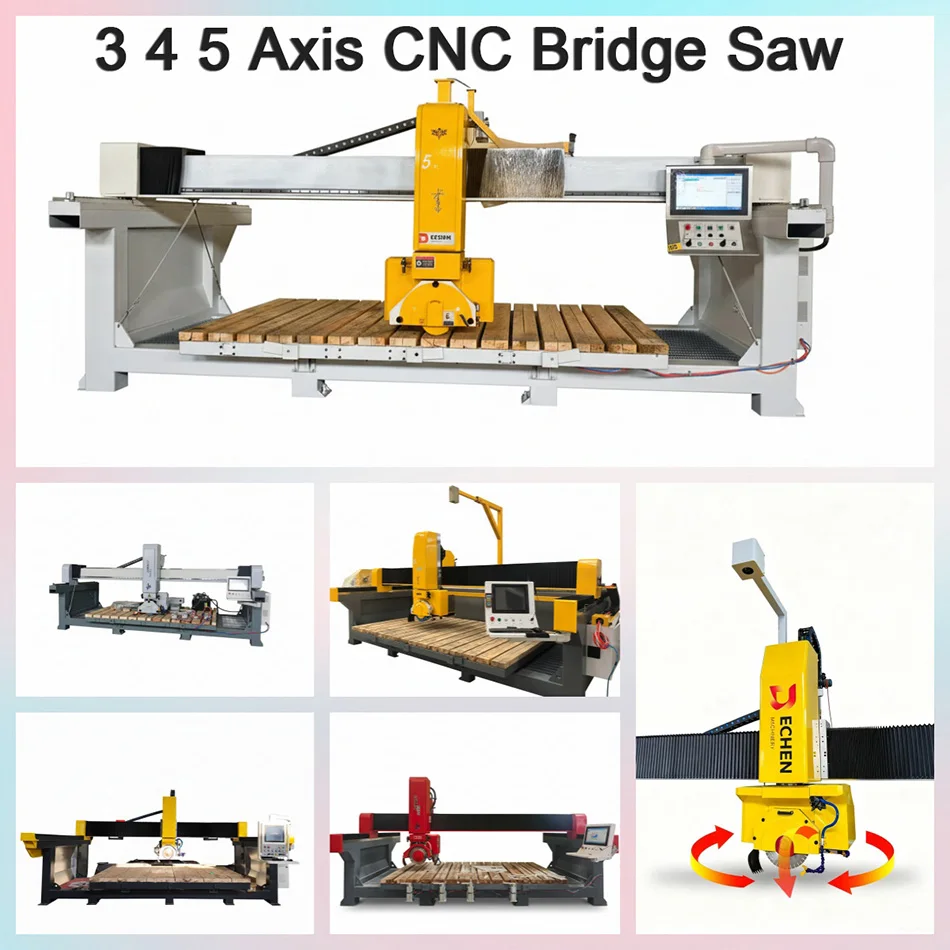 Professionalism: Dechen Machinery specializes in plate cutting equipment, product categories are, five-axis cutting machine, four-axis cutting machine, 4+1-axis cutting machine, three-axis cutting machine, and its supporting products: rock slab chamfering machine, stair tread edging machine, machining center, cutting and grinding machine and other deep processing equipment.
